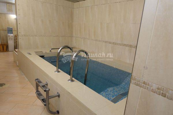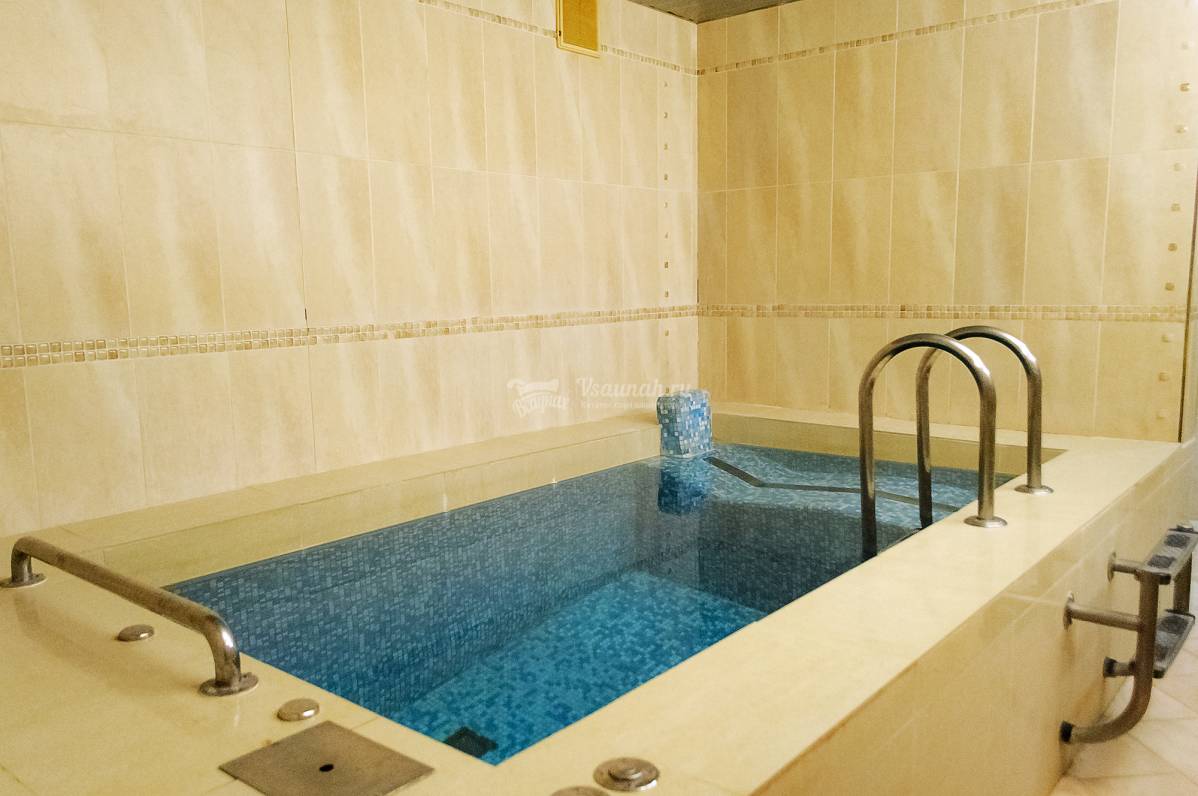 VIP. Рассчитано на посещение до 10 человек. Бассейн с теплой водой, примерно 2,5 на 4 метра. Гидромассаж (джакузи). Купель с холодной водой.